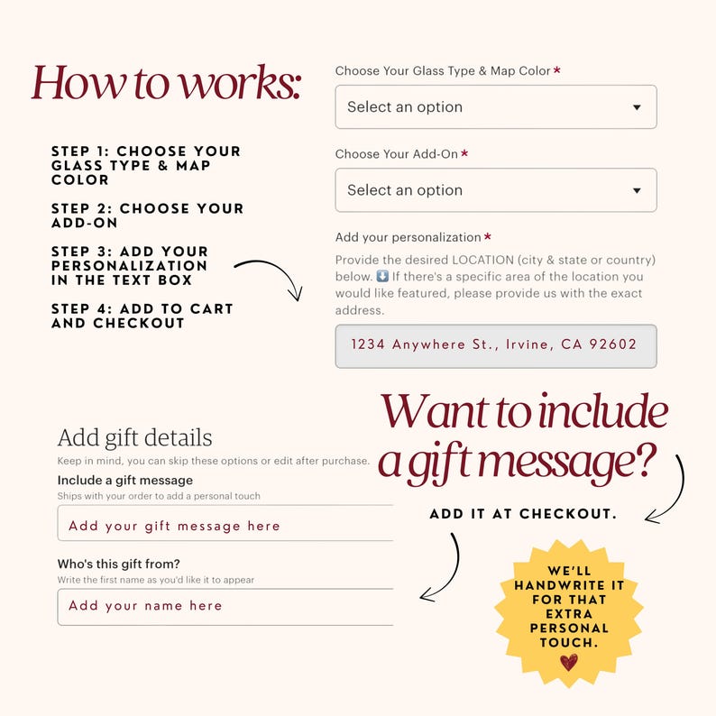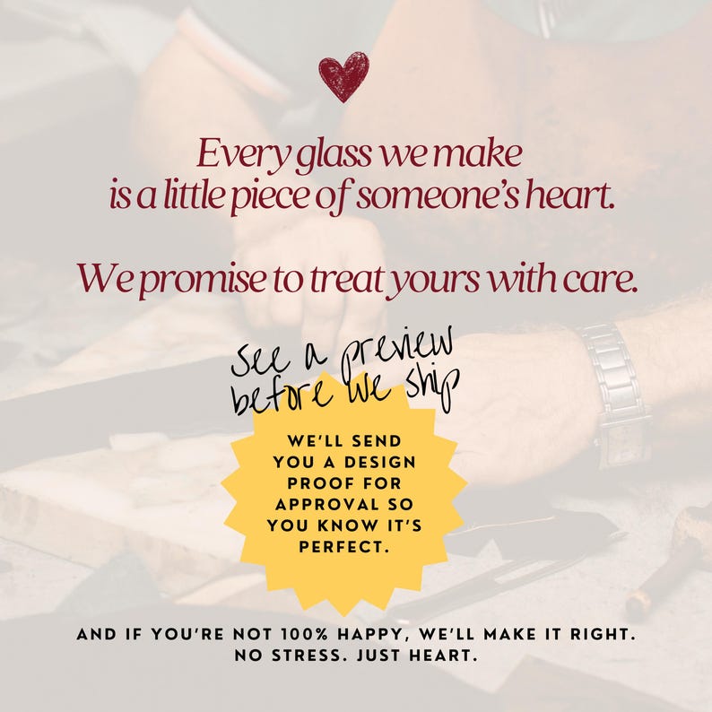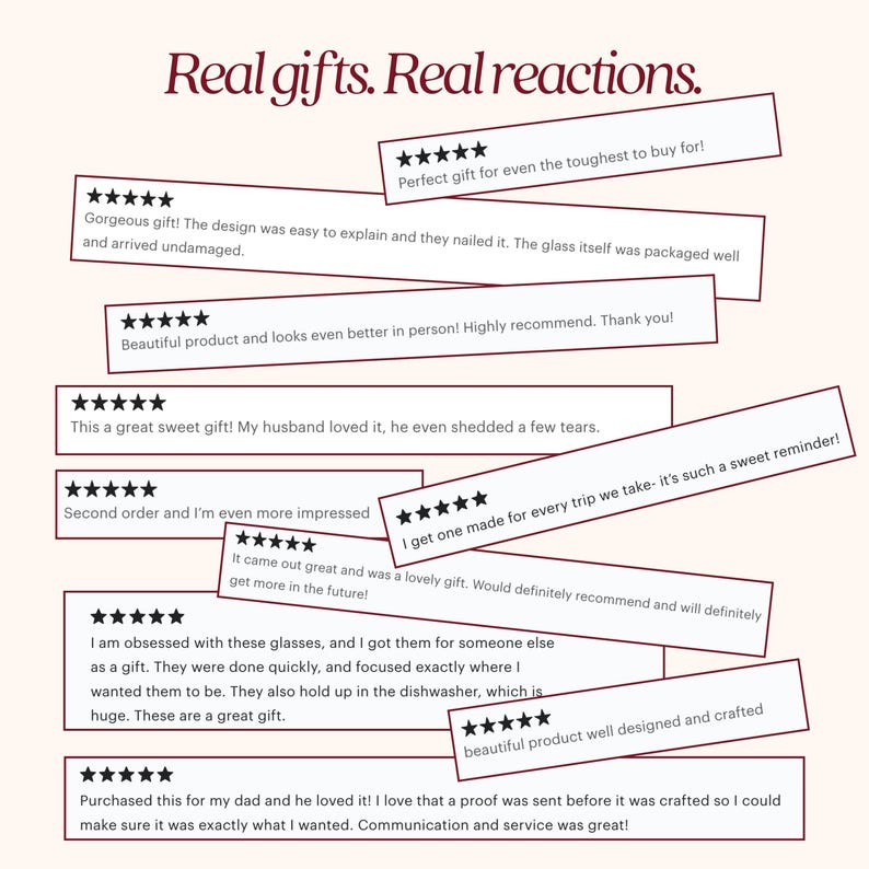 You choose a city that means something to them — where they met someone they love, where they grew up, or where life is taking them next. We make it permanent on a high-quality glass they can use every day.